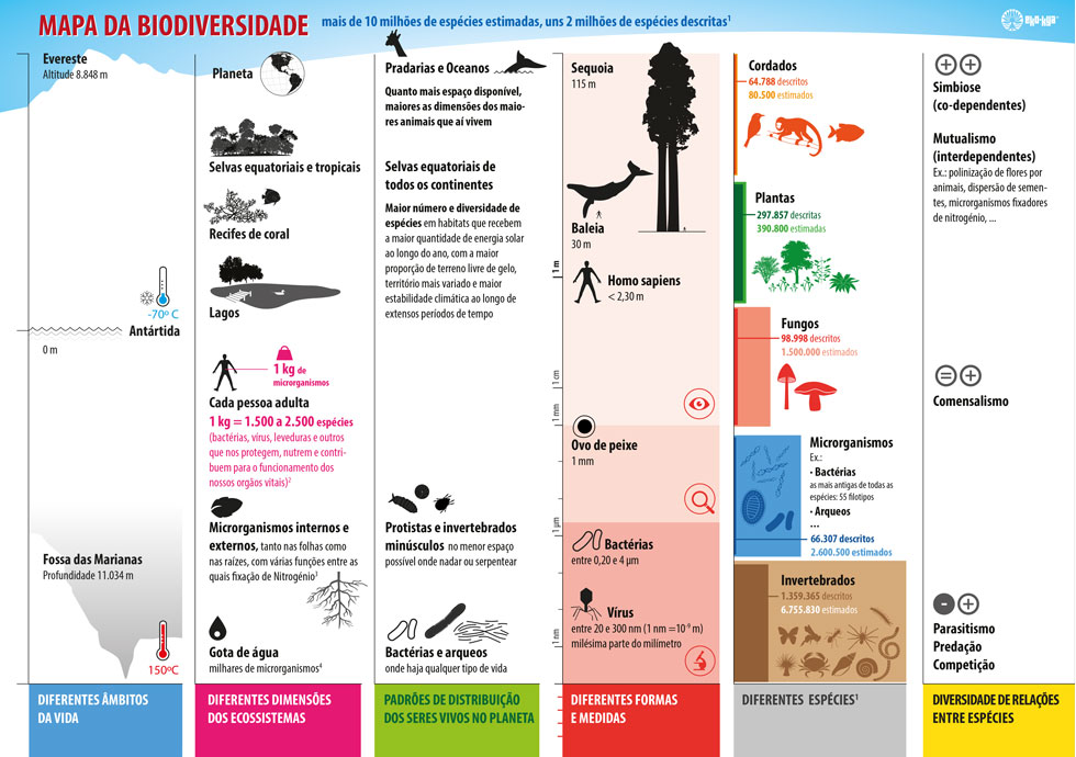 Para se situar e situá-las, ative a sua curiosidade e use o mapa da biodiversidade para descobrir várias dimensões da Vida. Ele foi feito a partir dos resultados de estudos e aventuras de milhares de investigadores.
